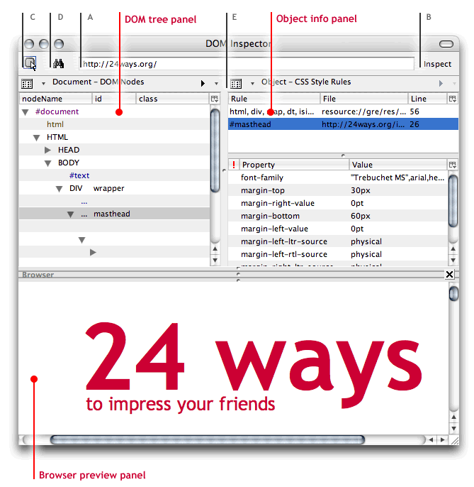 The Inspector will look at whatever site is in the front-most window or tab, but you can also use it without another window. Type in a URL at the top (A), press ‘Inspect’ (B) and a third panel appears at the bottom, with the browser view. I find this layout handier than looking at a window behind the DOM Inspector.