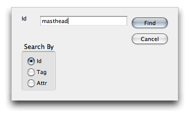 If you’re looking for an element that you know has an ID (such as <ul id="navigation">), or a specific HTML tag or attribute, click the binoculars icon (D) for “Finds a node to inspect by ID, tag or attribute” (You can also use Ctrl-F or Apple-F to do this if the DOM Inspector is the frontmost window) :