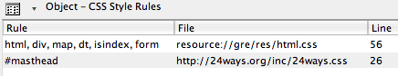 Once the node is selected, we move over to the right hand panel. Choose ‘CSS Style Rules’ from the document menu (E), and all the CSS rules that apply to that node are revealed, in the order that they load: